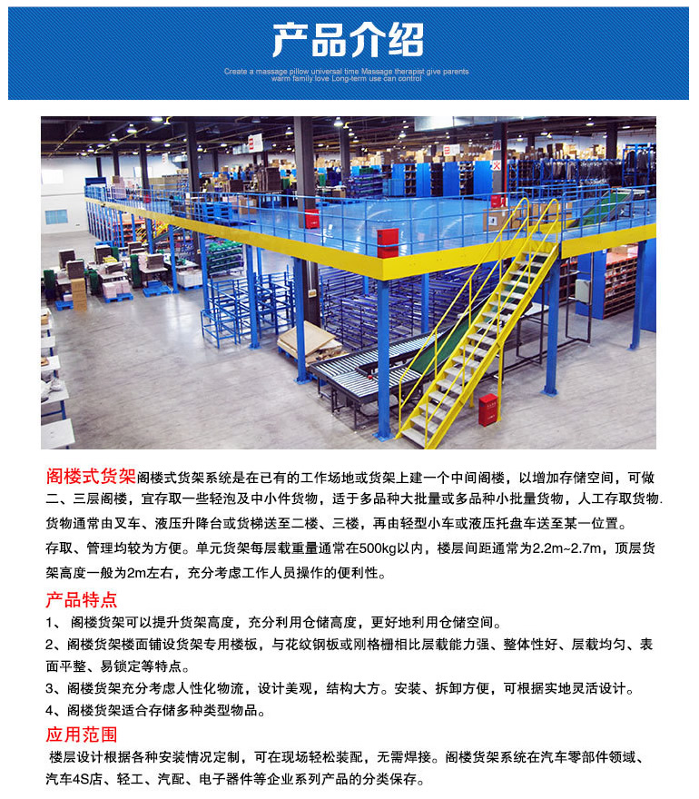 阁楼式货架系统是在已有的工作场地或货架上建一个中间阁楼,以增加存储空间,可做二、三层阁楼,宜存取一些轻泡及中小件货物,适于多品种大批量或多品种小批量货物,人工存取货物.货物通常由叉车、液压升降台或货梯送至二楼、三楼,再由轻型小车或液压托盘车送至某一位置。 近几年多使用冷轧型钢楼板,它具有承载能力强、整体性好、承载均匀性好、精度高、表面平整、易锁定等优势.有多种类型可选,并且易匹配照明系统,存取、管理均较为方便。单元货架每层载重量通常在500kg以内,楼层间距通常为2.2m~2.7m,顶层货架高度一般为2m左右,充分考虑工作人员操作的便利性。 楼层设计根据各种安装情况定制,可在现场轻松装配,无需焊接。阁楼货架系统在汽车零部件领域、汽车4S店、轻工、电子等行业有较多应用。 阁楼式货架的特点 1,阁楼货架可以提升货架高度,充分利用仓储高度,更好地利用仓储空间。 2、阁楼货架楼面铺设货架专用楼板,与花纹钢板或刚格栅相比层载能力强、整体性好、层载均匀、表面平整、易锁定等特点。 3、阁楼货架充分考虑人性化物流,设计美观,结构大方。安装、拆卸方便,可根据实地灵活设计。 4、阁楼货架适合存储多种类型物品。 结构与安装方法 阁楼式货架的结构与安装方法结构 阁楼式货架整体结构为拼装式,无须现场焊接,整体美观、大方。与混凝土结构或型钢结构相比,由于底楼货架本身起到上面楼层的支撑作用,具有成本低、空间利用率高的优点。 阁楼式货架面板有平板、花纹钢板、冲孔钢板等品种以适应防火、通风、光照等等不同使用要求。货物上下楼层可选择叉车、液压升降台、货梯等方式;货物同层运输通常使用小型手推车完成。 阁楼式货架通常承载能力在300KG~1000KG/平方米,立柱选择承载能力强、用钢量少的圆管;主次梁可以根据承载需要选择目前在钢结构工程中*经济合理的H型钢及萨克森公司开发的专用钢平台C型冷弯成型梁。 阁楼式货架楼面板选用萨克森专用特殊C型冷弯成型花纹钢板或镂空板,采用扣板式结构,与主次梁钢性固定,整个平台结构整体性强,可以根据实际需要选择不同的楼面板以满足消防或防灰尘、防小件坠落要求。楼面下方也可根据需要配置照明系统。 阁楼式货架广泛应用于库房较高、货物较小、人工存取、存储量较大的情况下,可充分利用空间,节约库房面积。根据实际场地和具体要求,可设计成单层或多层阁楼,一般为2-3层。特别适用于汽配、电子器件等企业系列产品的分类保存,承载≤500kg/层。