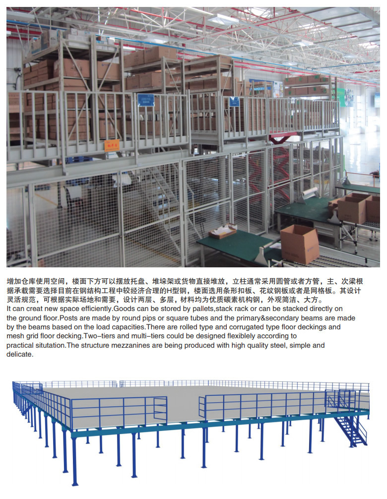 组成:平台结构通常由铺板、主次梁、柱、柱间支撑,以及梯子、栏杆等组成。 分类: 钢结构平台(3层) -按使用要求可分为室内和室外平台,承受静力荷载和动力荷载平台、生产辅助平台,以及中、重型操作平台等。 -按照支座处理方式的不同,平台结构还可分为: 直接搁在厂房柱的三角架或牛腿上的平台,功能通常为安全通道或为一种简单的中型操作平台。 一侧支撑于厂房柱或建筑物墙体,另一侧设独立柱的平台。 支撑于大型设备上的平台。 全部为独立的平台。 对受有较大动力荷载或有重量很大设备的平台,宜与厂房柱脱开设计,直接支撑于独立柱上。